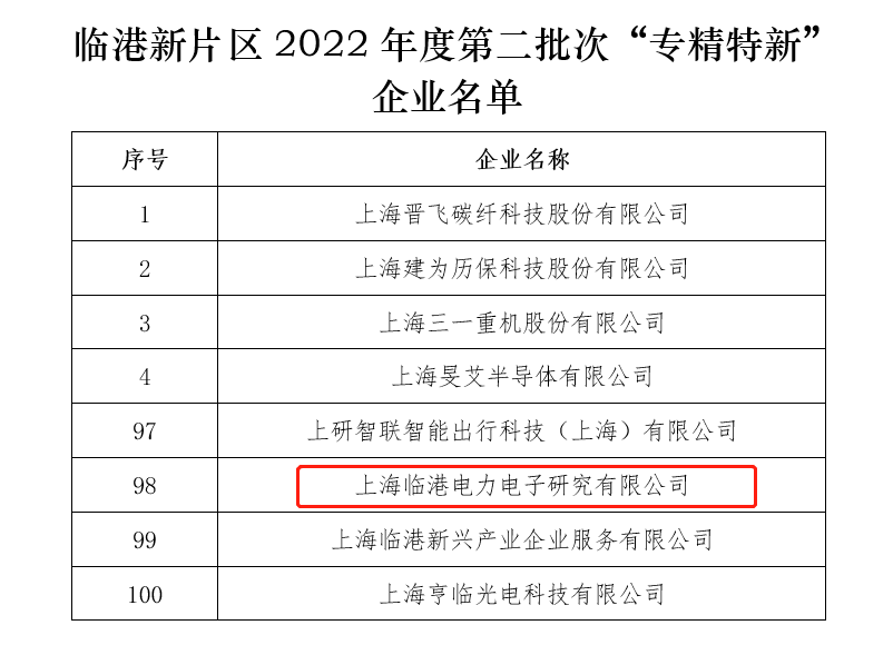 2月20日,臨港新片區管委會公示了2022年度臨港新片區第二批次“專精特新”企業名單,上海臨港電力電子研究院榜上有名。