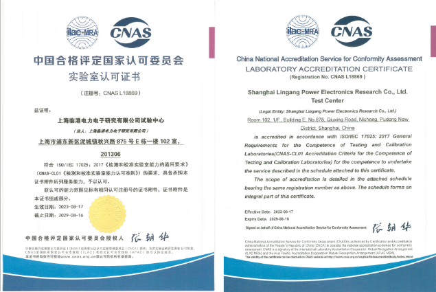 近日,上海臨港電力電子研究有限公司電力電子測試驗證中心正式通過中國合格評定國家認可委員會(CNAS)認可,并獲得實驗室認可證書。